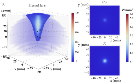 (a) Three-dimensional focal distribution of the flat Fresnel lens. (b) Top view of the light distribution at the focal point (Z = 0 mm). (c) Top view of the light distribution with the highest concentrated solar flux (Z = 30 mm).