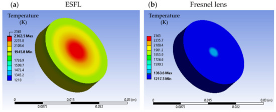 The respective temperatures of the ESFL and the flat Fresnel lens are shown in Figure 19. Both temperatures were generated from the focal distributions of Figure 17c and Figure 18b, respectively. The ESFL attained maximum and minimum temperatures of 2362 K and 1945 K, respectively, which were 1.73 and 1.60 times more than that of the Fresnel lens with the maximum temperature of 1363 K and minimum temperature of 1217 K, respectively.