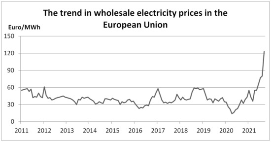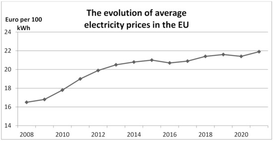 - Own Elaboration. Available online: https://ec.europa.eu/eurostat/documents/4187653/11581527/Evolution+of+household+electricity+and+gas+prices+in+the+EU.png/8e8a38f6-e791-ee36-c14c-844b91fad606?t=1634632173305 (accessed on 29 November 2021).