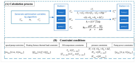 In this paper, to ensure the reliability of optimization results, eight constraint conditions are proposed. The main constraint conditions contain five aspects. The optimization model calculation process and the constraint conditions are shown in Figure 1. Besides, all the pump combinations are in series in the pump station, and the mode of three in use and one for standby is adopted.