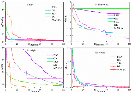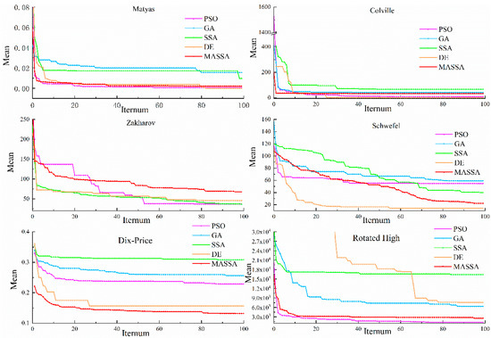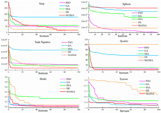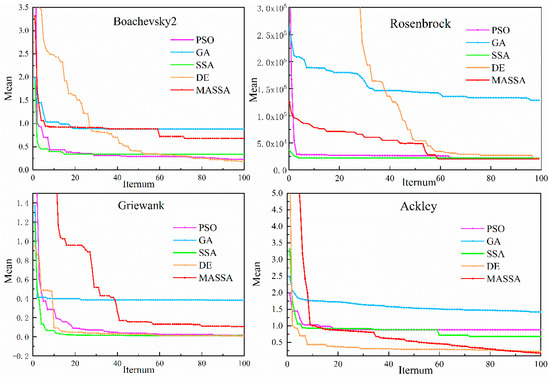 In this paper, 20 benchmark functions are used to verify the effectiveness and applicability of the MASSA, which includes unimodal functions and multimodal functions [16,34]. The unimodal benchmark function contains only one optimal solution and is easy to solve. Therefore, they are often used to test the exploitation ability of algorithms. However, the multimodal functions have multiple local optimal solutions. Compared with unimodal benchmark functions, their global optimal is more difficult to obtain. It can be used to test the exploration ability of algorithms. Besides, as the number of N increases, it becomes more and more difficult to find the global optimal. The recorded results of statistical analysis are shown in Table 5 and Table 6, including the mean fitness values and standard deviation (SD). In addition, a convergence rate analysis on the benchmark functions is also carried out, which can reflect the performance of MASSA more clearly, and the convergence rate pictures are shown in Figure 3, Figure 4, Figure 5 and Figure 6, which can show the convergence performance of all algorithms.