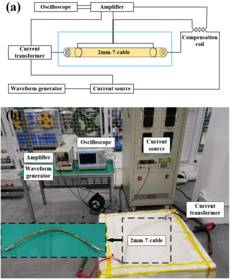 The AC loss measurement system used in this paper is mainly composed of a waveform generator, a current source, a current transformer, an amplifier, an oscilloscope, and a compensation coil. The schematic diagram of the whole measurement system is shown in Figure 3a, and the actual picture is shown in Figure 3b. The experimental steps are as follows: Controlled by the waveform generator, the current source sends out AC current signals with specified cycle, frequency and amplitude. The transformed current signal is collected by the oscilloscope through the filter amplifier by adjusting the relative position of the compensation coil. The voltage signal in the same phase as the current signal is also collected by the oscilloscope after being filtered and amplified. The experimental value of AC loss can be obtained by integrating the compensated voltage and current data. In this study, all the AC loss measurements were carried out in 77 K liquid nitrogen.