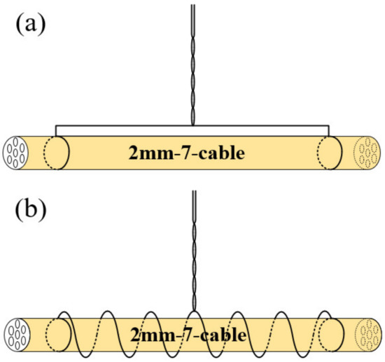 Four-point method is adopted for AC loss measurement. The two ends of 2 mm-7-cable are inserted into copper terminals which is slightly larger than the cable, and solder is poured to fill the gap between 2 mm-7-cable and copper terminals for fixation and electric conduction. The current-leads are connected to the copper terminals of 2 mm-7-cable. For voltage-leads, as there is no precedent to measure the AC loss of this twisted cable structure, two connection methods are designed. The first connection method is the same as the traditional voltage-lead connection. Keep the voltage-leads parallel to the surface of 2 mm-7-cable and wind them into one at the place where the voltage-leads meet, as shown in Figure 4a. A rectangular gap is formed between the voltage-leads and the surface of 2 mm-7-cable. This voltage-lead arrangement is named as square-lead arrangement. Another method is to keep the voltage-leads parallel to the surface of the 3S wires and let it spirally wrap on the 2 mm-7-cable, as shown in Figure 4b. The voltage-leads also meet in the middle. The second connection method is named spiral-lead arrangement. Only when the voltage-lead is high enough and the rectangular area is large enough can the complete loss voltage induced by saturated magnetic flux be collected on the voltage-lead.