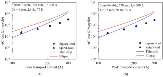 Figure 5. Comparison of AC loss of 2 mm cable under two voltage−lead arrangements. (a) AC loss values when the distance between the voltage−leads and the cable sample is 0 mm and the frequency is 25 Hz; (b) AC loss values when the distance between the voltage−leads and the cable sample is 15 mm and the frequency is 50 Hz.