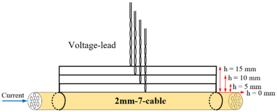 In addition, the influence of voltage-lead height on AC loss measurement is studied. For a single HTS tape, in order to measure the loss voltage correctly, the distance between the sample surface and the voltage lead should be kept at the distance about three times the tape half-width [14]. However, for the twisted cable structure in this study, the influence of voltage-lead height on AC loss is not clear, so we design an experiment to evaluate the influence of voltage-lead height to guide the application of high current HTS twisted cable in the future. As shown in Figure 6, four voltage-leads with different heights are welded on the same 2 mm-7-cable at the same time, and the two ends of the voltage lead are fixed on the same solder joint. The voltage leads are kept parallel to the surface of the 2 mm-7-cable. The distance between the voltage-taps is 770 mm. As we can see in Figure 7, when the height of voltage-leads increases from 0 mm to 5 mm, 10 mm, and 15 mm, the value of AC loss does not change significantly.