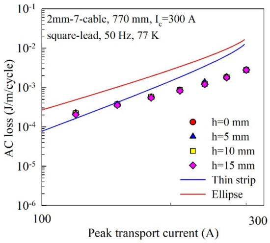 Figure 7. Dependence of height of voltage-lead configuration on AC loss for 2 mm−7−cable.