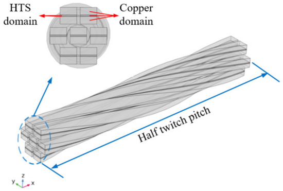 The geometric dimensions and parameters of 2 mm-7-cable are set as shown in Table 1 so as to correctly compare the difference between the experimental value and the simulation value. In order to speed up the calculation speed, some parameters have been optimized: the width of the HTS layer in the REBCO tape is 2 mm, while the thickness is only 1 μm. In COMSOL, such a large width-to-thickness ratio will lead to a surge in the number of meshes, increasing the calculation convergence difficulty. Thus, in this model, the thickness of the superconducting layer is increased by 10 times to 10 μm, which will not affect the accuracy of the calculation results and greatly speed up the calculation speed [19]. In addition, the cable length is set as the half-twist pitch, which also greatly reduces the degree of freedom and speed up the calculation. The substrate layer, copper layer, and other parts of the HTS tape except the superconducting layer are regarded as the copper domain, and the distance between the two superconducting layers is 150 μm. The 3D view and side view of the geometric model are shown in Figure 9.