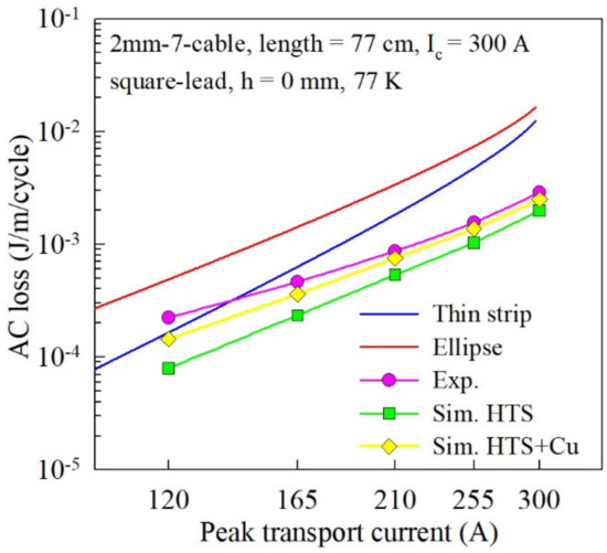 Figure 10. Comparison between experimental and simulation values of AC loss of 2 mm−7−cable.