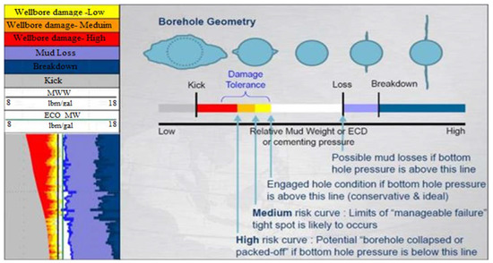 - Kicks: the kicks are represented by the pore pressure shown in grey in the track of Figure 2 [21]. When greater than the pressure generated by the mud density, there will be a collapse of the wellbore [4];