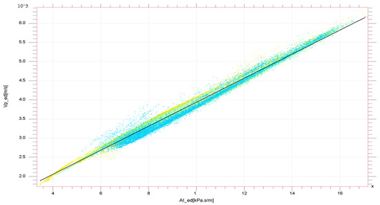 The relation between the Vp and the acoustic impedance (AI) was extracted by using the cross plot from logging data from the four wells [26]. It can be seen from Figure 4 that the relationship is linear, and it is expressed by Equation (1):