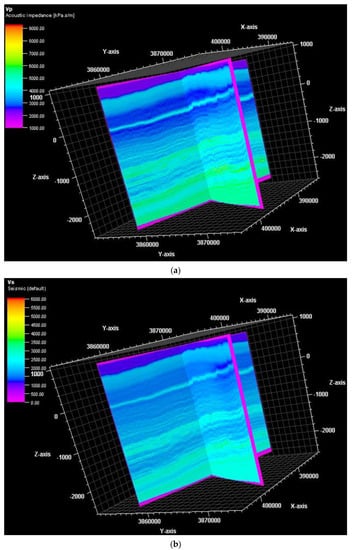 As the acoustic impedance volume was obtained from the seismic inversion results, a simple calculation was used to deduce the volume of the acoustic velocities, as shown in Figure 5a. Since the volumes of the ratio Vp/Vs and of Vp were calculated, the volume of Vs could, therefore, be directly deduced, as demonstrated in Figure 5b [16].