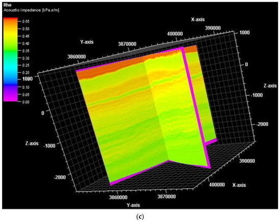 Volumes generated using seismic inversion: (a) acoustic velocities (m/s), (b) shear rates, (c) density AI (k.Pa.s/m).