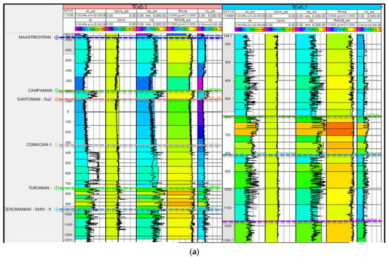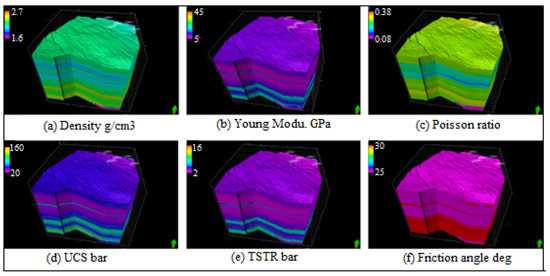 Once the grids were created, they were filled with the mechanical properties that characterized the rock; namely, the density, the elastic properties (Young’s modulus, Poisson ratio, and Biot coefficient), and the resistance properties (UCS, the resistance of the rock to tension, and the friction angle) [10]. These properties were calculated using the same method as in the 1D model constructed earlier in this study and with the same mathematical relationships [17]. The inputs of the model were the density volumes, Vp and Vs, and the dynamic elastic properties, which were determined directly from the inputs through the Gassmann equations (Equations (2)–(5)) [36,37].