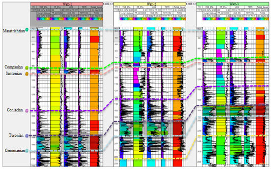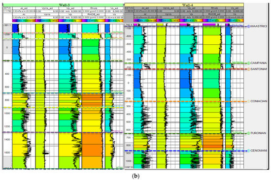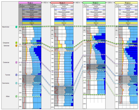 In Figure 16, the drilling mud density window is represented by the white block located in the middle of the tracks. Hence, to avoid the various fractures previously mentioned for well 5, mud densities were estimated for each interval based on the results of the 3D geomechanical model [43]. For the interval 0–600 m MD (Maastrichtian), the obtained mud weight was MW = 1.05 g/cm3 (WBM); for the interval 600–1200 m MD (Maastrichtian–Campanian–Santonian), MW = 1.23 g/cm3 (OBM); for the interval 1200–1681 m MD (Coniacian), MW = 1.05 g/m3 (OBM); and for the interval 1681–2000 m MD (Turonian–Cenomanian), the obtained mud weight was MW = 1.05 g/cm3 (OBM). These mud density values can ensure wellbore stability with minimum damage to the targeted reservoir, as confirmed during the process of drilling well 5 and its reservoir evaluation.