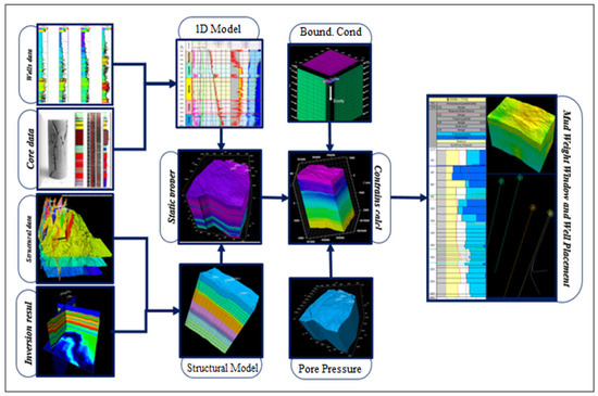 Figure 2. Typical flowchart of adequate mud density identification. - Shear failure: the shear failure is presented in red in the left track of Figure 2. It provides formation-breaking pressure due to the maximum in situ stress [21,22];