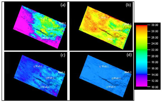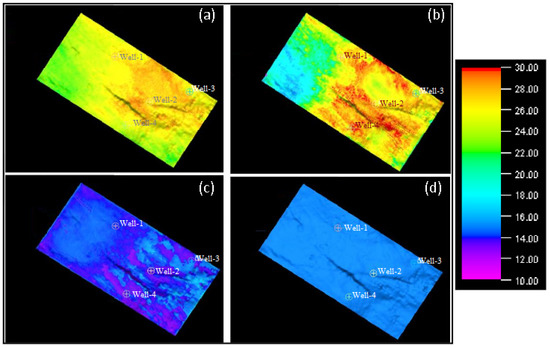 It can be noted from Figure 10 that the properties calculated from the 3D cubes, which resulted from the inversion, remained faithful to the 1D models at wells 1, 2, and 3 [38]. Some inaccuracies were observed at the level of well 4 since the inputs (Vp, Vs, and Rhob cubes) were generated from logging data, which presented some unreliability problems for density logs at this well due to the presence of washout and doglegs (bad quality of the borehole).
