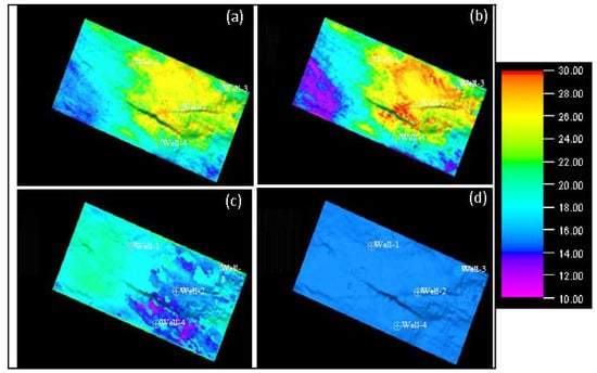 Simultaneous seismic inversion was carried out on the data from the studied field. The data contain four processed cubes with four stack angles: 5–10°, 10–20°, 20–30°, and 30–40°. From structural interpretation results, eight seismic horizons were identified as follows: (1) Maastrichtian, (2) Campanian, (3) Santonian, (4) Coniacian, (5) Turonian, (6) Cenomanian, (7) Albian, and, finally, (8) Aptian. In addition, logging data for the four drilled wells were prepared and used to correlate the inverted model to the directly measured logs. Figure 1 demonstrates the high correlation between the density volume obtained from the inverted model and the density from the well logs ([16,17]).