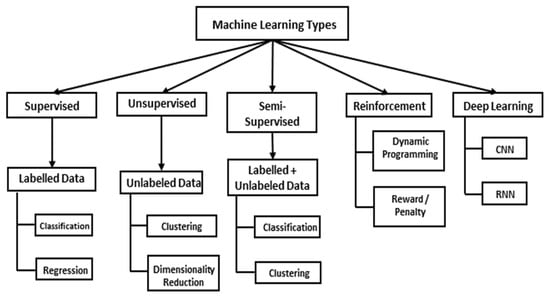 Machine learning (ML) is a process where “A computer is said to learn from experience to some class of task T and performance measure P, if its performance at task T, as measured by P, improves with experience E” [9]. Machine learning uses statistical methods to learn and progressively improve without being programmed. It is categorized into four approaches, supervised learning, unsupervised learning, reinforcement learning, and semi-supervised learning, based on how the algorithms learn [10]. Different machine learning types are discussed below and shown in Figure 2.