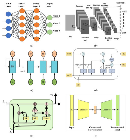 The architecture of different neural networks. (a) Fully Connected Neural Network (FCNN) (adapted from [14]), (b) Convolutional Neural Network (CNN) [22], (c) Recurrent Neural Network (RNN) [23], (d) Long Short−Term Memory (LSTM) [24], (e) Gated Recurrent Units (GRU) [25], (f) Autoencoders (AE) [26].