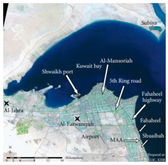 The urban areas in the state of Kuwait (Figure 1) have experienced an “exponential growth in the number of motor vehicles” as a result of the “rapid economic evolution, and low prices of vehicles” []. Thus, recent studies have expounded that the main obstacle in the transport sector is that the supply of “transport facilities has not matched the increase in demand” []. Recent studies have also emphasized the importance of developing new strategies that aim to contain/reduce the impact of traffic congestion (visualized by an increased number of cars queuing on the road). This congestion is an “important issue in urban network due to the negative impacts such as delays, wasted fuel consumption, which causes atmospheric pollution” []. Subsequently, “traffic congestions and rush hours within city limits and along major highways (i.e., King Abdulaziz (Fahaheel), 5th and 6th ring roads) contribute mainly to the levels of CO, and VOC in the air” []. According to these statistics, it is also critical to take into consideration the fact that for “every 33 residents in Kuwait, there are 100 cars registered” [].