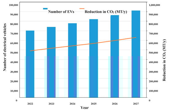 Another analysis conducted by the International Energy Agency (IEA) showed that the CO2 emissions increased by 1.5% in 2017, led by China, India, and the European Union [,], whereas Middle Eastern countries recorded an extraordinary increase in CO2 emission in the last two decades. Based on the Energy Information Administration (EIA), the CO2 increased by over 200% in Middle Eastern countries. Road vehicles contribute around 75% of CO2 emissions of the transportation sector among the different modes of transportation []. Hence, moving to electrical vehicles and the electrification of all road transportation is a critical step in reducing direct CO2 emission []. Another study conducted by Al-Foraih et al. [] predicted that the CO2 emissions from vehicles would increase by 77% from the base year of their research (2016). Assuming 3% of vehicles are replaced every year with EVs, the reduction in CO2 will be significant and will help reduce per-capita CO2 emissions. The following graph (Figure 2) summarizes our estimation based on the results of Al-Foraih et al., assuming a 3% replacement rate and using the estimation of the impact on CO2 emissions [].