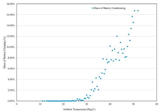 Besides driving and air-conditioning requirements in ICE cars, in EVs energy is used for battery conditioning (BC) as well. The share of BC is insignificant in the lower ambient conditions, but starts building up along with ambient temperature. One year of data was used to understand the relationship between ambient temperature and BC, plotted in Figure 4.