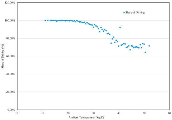 While calculating the effective energy used for driving, the results did not match the manufacturer’s specifications during the summer. The utilization of energy matched the manufacturer’s specifications until the ambient temperature reached 30 °C (Figure 5). Once the ambient temperature crossed that threshold, the driving share started declining to as low as 64%. This could be one of the reasons behind the performance deviation between summer and winter data.