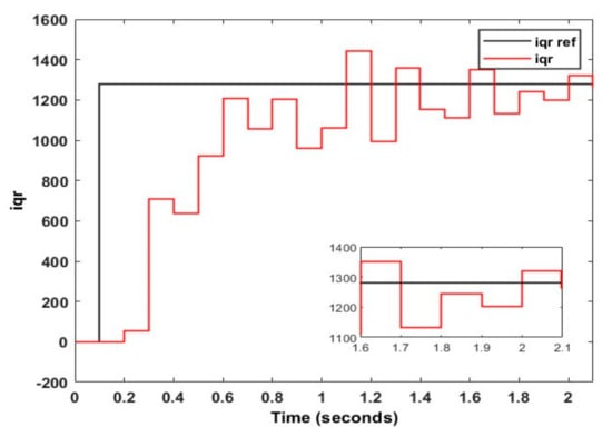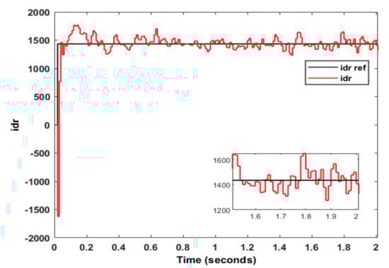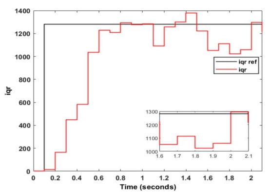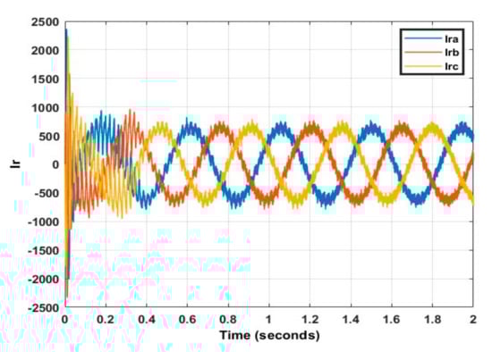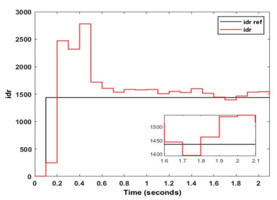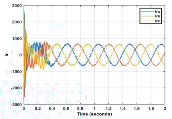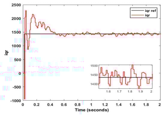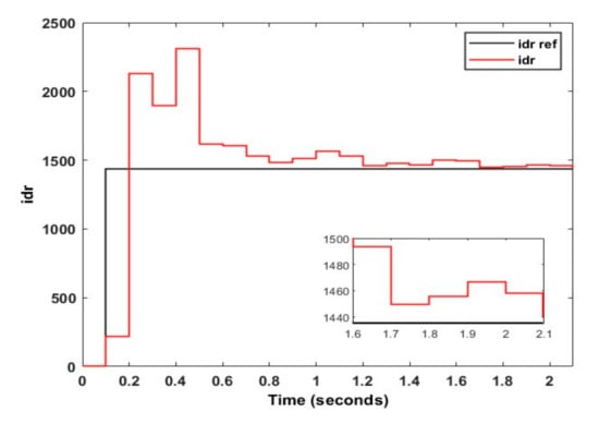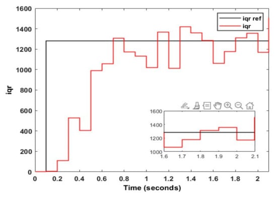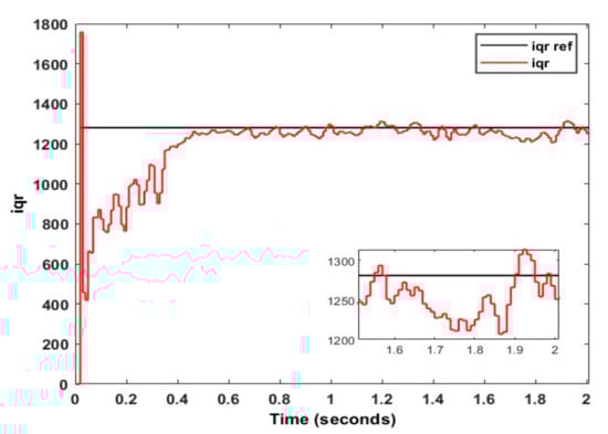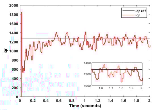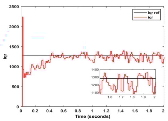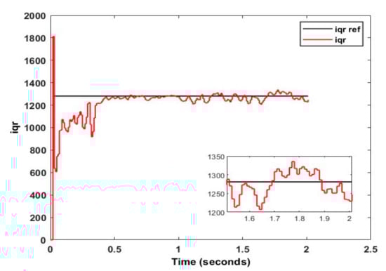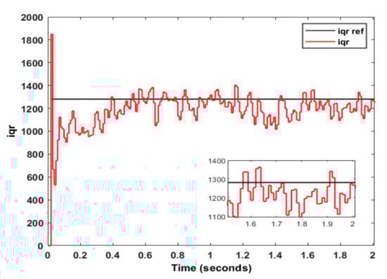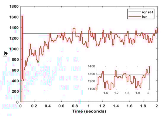 31]. The control system implemented was stator flux-oriented control. This means that the stator reactive power was controlled by the rotor direct current, and the stator active power by the rotor quadrature current. The results obtained were evaluated in terms of steady-state error, steady-state ripple, and overshoot. Owing to the direct proportional relationship between the rotor currents and the stator power, the output of the DFIG can be directly analyzed from the waveforms of the rotor currents. These relationships can be observed in [