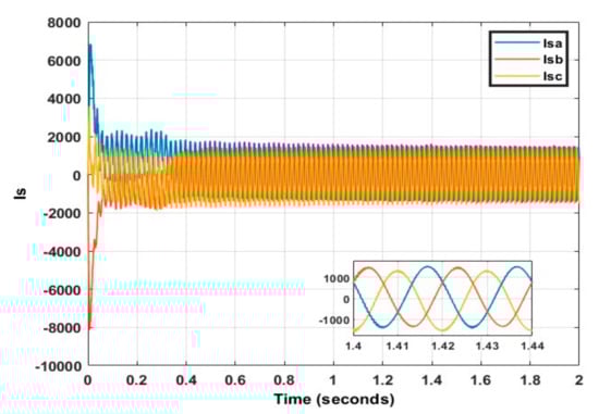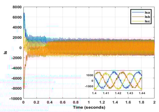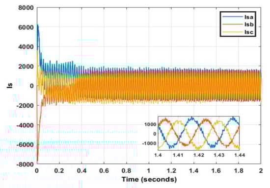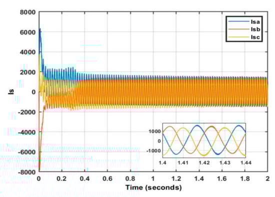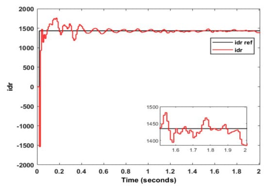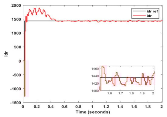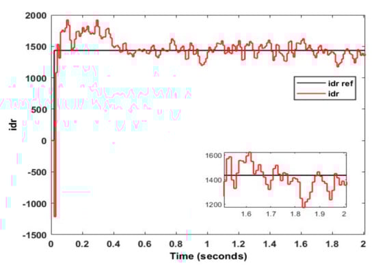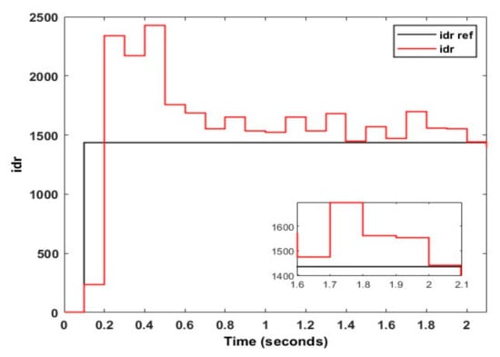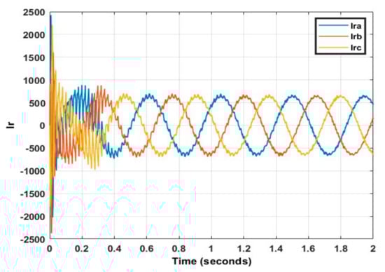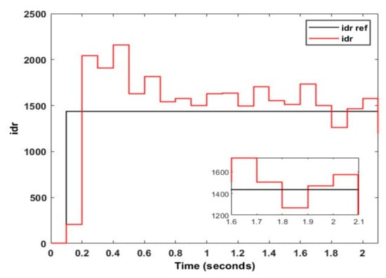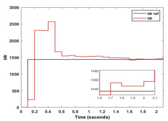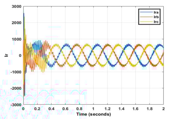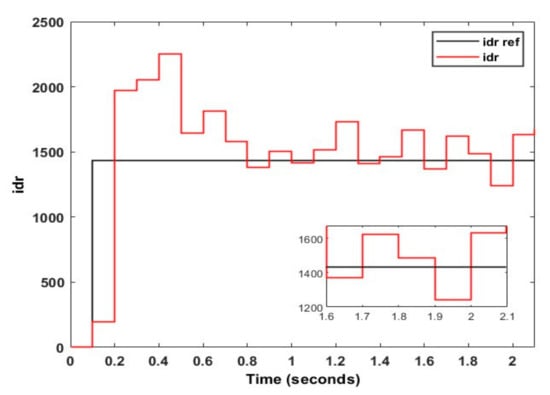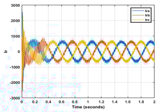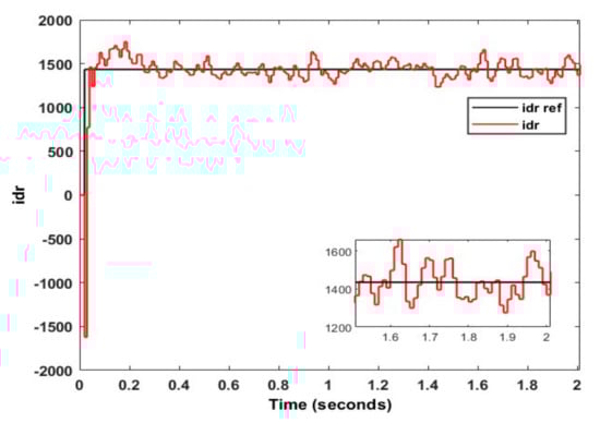 31]. The control system implemented was stator flux-oriented control. This means that the stator reactive power was controlled by the rotor direct current, and the stator active power by the rotor quadrature current. The results obtained were evaluated in terms of steady-state error, steady-state ripple, and overshoot. Owing to the direct proportional relationship between the rotor currents and the stator power, the output of the DFIG can be directly analyzed from the waveforms of the rotor currents. These relationships can be observed in [