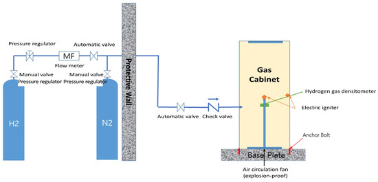 The hydrogen gas concentration inside the gas cylinder cabinet is set to 39 ± 5 vol%, and hydrogen is injected while controlling the pressure and flow rate using a commercially available hydrogen container.