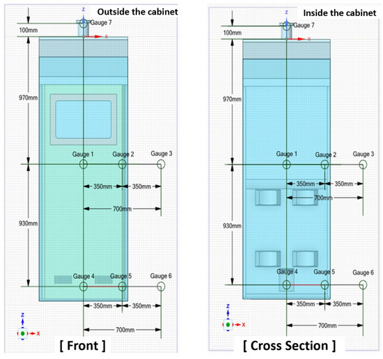 Pressure gauge sensors were installed at the center, at the rear center, at the side center of the inside of the gas cylinder cabinet at the center height (P1, P2, P3), at the center, at the rear center, at the side center of the inside of the gas cylinder at the lower height (P4, P5, P6), at the center of the side wall (P7), at the upper pipe part (P8), and incident pressure gauges were installed at the center (P9) and lower part (P10) of the height of the gas cylinder cabinet at a position 350 mm away from the door in the diagonal direction in order to measure the incident pressure. In addition, in order to measure the strain rate of the gas cylinder cabinet according to the explosion load, two-axis strain gauges (S1-X, S1-Y, S2-X, S2-Y) were installed on the left and right sides of the center of the outer side walls of the gas cylinder cabinet.