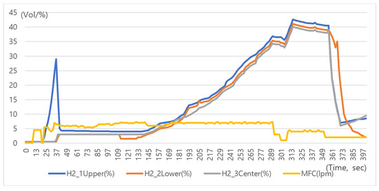 Hydrogen was injected at a concentration of 39 ± 5 vol% in consideration of actual usage conditions to conduct internal explosion pressure and hydrogen gas injection tests. The hydrogen concentration was measured at the top, center, and bottom, respectively, and the concentration at the center where the ignition device was located was set as the reference concentration. A value of 40.382 vol%, which is the maximum concentration value, was shown when 317.6 s passed after the supply of hydrogen began, and the concentration gradually decreased. The ignition was carried out at a hydrogen concentration of 38.357 vol%. The changes in the hydrogen supply and hydrogen concentration are shown in