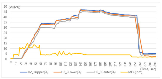 In the state where the pipe above the gas cylinder cabinet was closed too, the hydrogen concentration was measured at the top, center, and bottom, respectively, identically to the state where the pipe was opened, and the concentration at the center where the ignition device is located was set as the reference concentration. A value of 44.868 vol%, which is the maximum concentration value, was shown when 145.9 s passed after the supply of hydrogen began, and the concentration gradually decreased. The ignition was carried out at 258.4 s, when a hydrogen concentration of 39.07 vol% was reached. The changes in the hydrogen supply and hydrogen concentration are shown in
