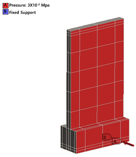 The boundary conditions to conduct structural analysis for the evaluation of the protection performance of the protective wall were applied based on the explosion pressure of about 0.3 bar generated at the center point in the gas cylinder cabinet during the verification experiment, and the state where the boundary conditions were applied was as follows in