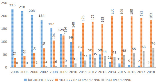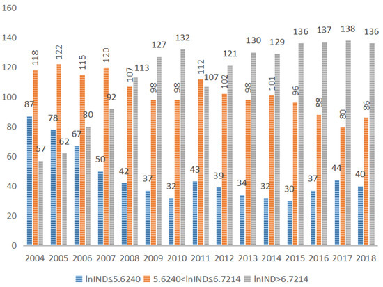 Figure 4 shows that in 2004, the proportion of cities in the low-value region is about 35% (the number is 91), the proportion of cities in the median region is about 45% (the number is 117), and the proportion of cities in the high-value region is about 21% (the number is 54). While, in 2018, this proportion changed to 5%, 53%, and 42%, respectively. Therefore, we conclude that by the end of the period, the number of cities in the middle-high value region accounted for more than 90%, that is, most cities have crossed the first threshold and are in the stage where FDI inflows can significantly drive green innovation.