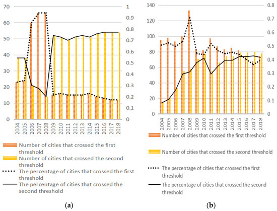 Figure 8. The human capital level of innovative cities all crossed the first threshold in 2007, while non-innovative cities did not all cross the first threshold until 2018. Referring to the number of cities across the second threshold, innovative cities increased from 41 cities in 2004 to 57 cities in 2018 (the total number of innovative cities is 70), and non-innovative cities increased from 43 cities to 83 cities between 2004 and 2018 (the total number of non-innovative cities is 188). We conclude that compared with innovative cities, the human capital level and the growth rate of non-innovative cities are relatively low.