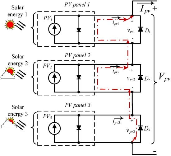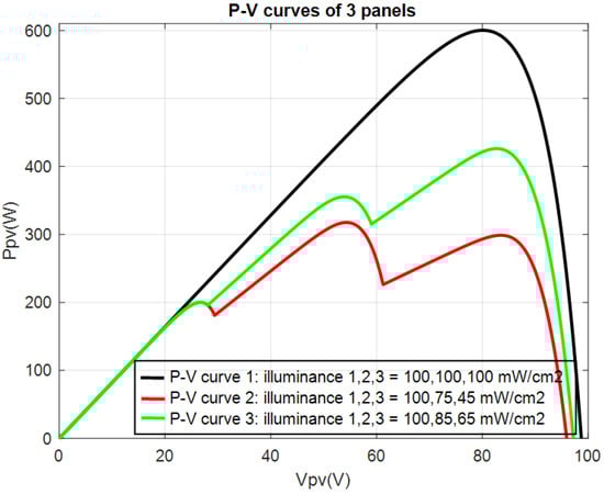 For the standalone PV power system, the PV panels are connected in a parallel and series configuration. In the case of uniform PV illumination intensity, all PV panels will emit the same current and voltage. As shown as the black P-V curve in Figure 2, only one power peak appears on the P-V curve, where it is easily found by traditional MPPT methods as well as modern MPPT methods. In contrast, when the illuminance intensity on the PV panels is not uniform, the P-V curve will have many power peaks, e.g., the red and green P-V curves as shown as in Figure 2. In which there is one highest power peak called the global maximum power point, and the remaining peaks have smaller power values called local maximum power points. Since the partial shaded PV panels only provide low output currents, the overall efficiency is limited. Furthermore, each PV panel is parallel with a bypass diode, as an example shown in Figure 3. At that time, the bypass diode will conduct the current of the whole PV system to bypass the shaded PV panel which can only provide a lower limited current. As a result, the power of the PV system under the partial shading effect is improved. For example, when the illuminance intensity of the PV panels in Figure 3 are distributed in 100, 75, 45 mW/cm2, the PV output current and output voltage have the relationship given in Table 2, where , , respectively, are the short-circuit currents satisfying . In other words, the shaded PV panel may be isolated for some cases of load currents. This induces multiple power peaks in the P-V curve under partial shading influences as shown as Figure 2.
