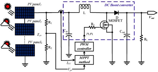 For some applications requiring a larger voltage for loads, the boost converter is used in the PV power conversion system [,]. To obtain high power conversion efficiency, the system is controlled for impedance matching between the PV panels and load by adjusting the duty ratio () of the boost converter in MPPT control. The basic structure of the boost converter is illustrated as shown in Figure 4. Assume that the transient response of the boost converter is omitted. The duty ratio can be determined by: