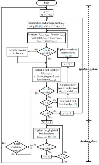 where ; is the worst location; is an adjustment coefficient to be less than 0.5. It is a worthwhile note that the global best racehorse is also updated by Equation (14) to join the race in the next lap for avoiding the local maximum point. After this update process, the new power performance (race score) is measured again to continue the race. As a result, this step has a great advantage to avoid falling into local traps and to efficiently search the global MPP when the PV system has multiple maximum power peaks. Next, the removal of low power locations is still carried out in progress, while the global best power locations are updated after every lap. This process is continued until (11) is met or all racing groups have completed their race.