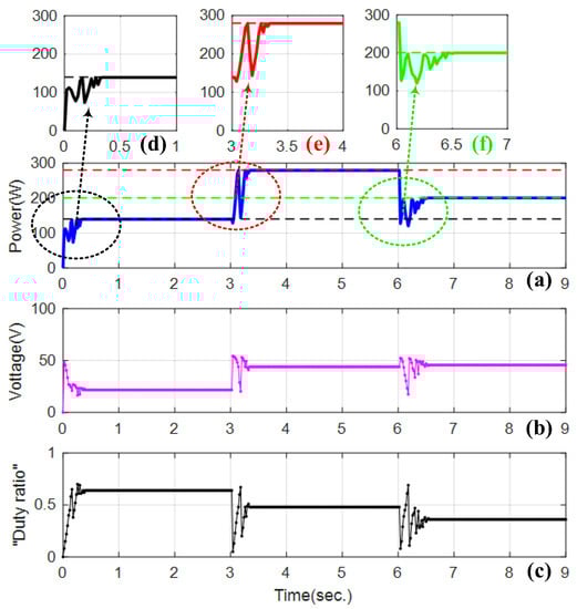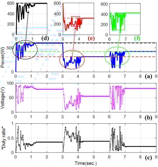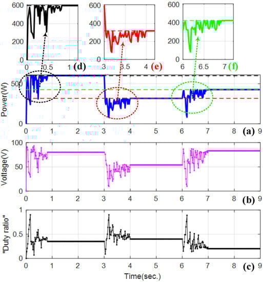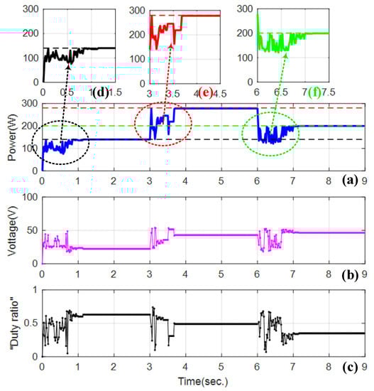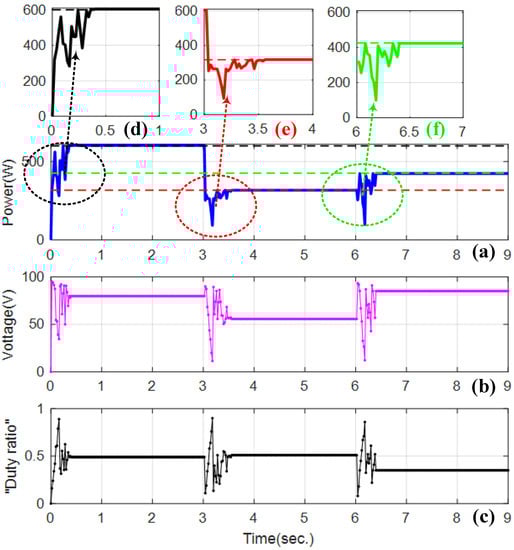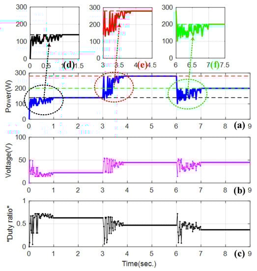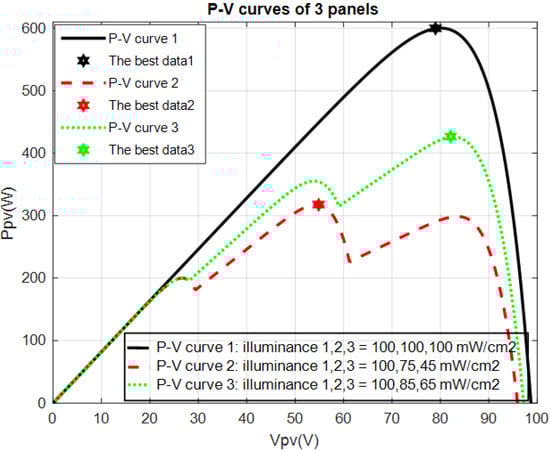 Consider three PV panels connected in series for the PV power system. Assume that three situations of solar irradiance intensities occur and result in the P-V characteristic curves as shown in Figure 6. The black, red, and green color curves represent the three irradiance situations, respectively, where the second and third situations are the partial shading cases. The hexagon is the best location with the global maximum power. To verify the validity of the proposed method, various irradiance intensities are considered in the simulation, where the three situations occur in turn, i.e., the irradiance situation 1 occurs from 0.0 to 3.0 s, the situation 2 occurs from 3.0 to 6.0 s, and the situation 3 occurs from 6.0 to 9.0 s.