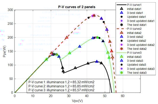 In this case, we consider two PV panels connected in series for the PV power system. Assume that three situations of solar irradiance intensities occur, where the three irradiance situations are assumed to be (85, 32) mW/cm2, (85, 85) mW/cm2, and (85, 57) mW/cm2 for the two panels, respectively. The ambient temperature is 22 °C. The resultant P-V characteristic curves are shown in Figure 10, where black, red, and green color curves represent the three irradiance situations, respectively. The first and third situations are the partial shading cases. The hexagon points are the best locations with the global maximum power 140, 280, and 200.5 W for the situations 1 to 3, sequentially. The three radiation intensity situations will be considered in the simulation and experiments.