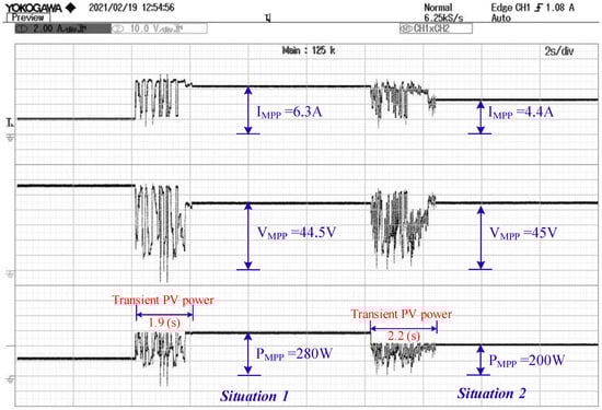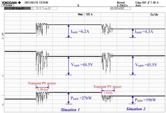 The experimental environment has an ambient temperature of 21–23 °C and normal irradiance intensity of 83–87 mW/cm2. When the partial shading (generated by manual work) occurs on one of the two PV panels, the measured irradiance intensities are 85 and 57 mW/cm2, i.e., the situations 2 and 3 in Figure 10 are used for the verification. The parameters of the proposed HRA method and the PSO, GWO algorithms are established as the simulation setting above.