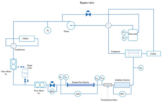 As described in [8,27], the experimental setup was a closed loop system with a main tank for storing refrigerant, a magnetic coupled gear pump for distributing the refrigerant, a preconditioner for controlling the vapor quality of the fluid at the inlet of the test section, a visualization glass for visualizing the flow, an adiabatic and diabatic test section, and a condenser for cooling the refrigerant during the experiment from the test section. The schematic representation of the test facility is shown in Figure 1. R134a was the working fluid for this study. Saturation condition in the store tank controls the pressure in the test section. The inlet temperature of the refrigerant is controlled by a shell and tube heat exchanger with glycol flowing in the shell side. A Coriolis mass flow meter installed before the heated test section was used to measure the flow rate of the refrigerant before it enters the test section. The test section shown in Figure 2 is a 5 mm internal diameter, 8 mm outer diameter, and 2035 mm-long stainless steel is supplied with heat by the Joule effect with a rectified sine wave. The test section was heavily insulated against heat losses to the external environment. With the test section, ten (10) thermocouples were fitted externally on the lower section and seven (7) on the upper section. At specific location, 1117 mm and 1917 mm from the inlet thermocouples, internal thermal thermocouples were fitted on the top, bottom, and side walls of the tube. Variables such as temperatures, absolute pressures, differential pressure, and mass flow rate were obtained at a frequency of 10 Hz. The data were acquired with the LABVIEW National Instrument data acquisition system.
