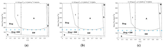 Figure 9a–f shows the flow patterns for an increasing saturation pressure at G150 kg/(m2s), q″ 8.26 kW/m2 (Figure 9a–c), and q″ 23.3 kW/m2 (Figure 9d–f) as predicted by a well-known flow pattern map from Wojtan et al. The flow patterns predicted for these experimental conditions are a mixture of slug and stratified wavy, purely stratified wavy, and dryout. Increasing saturation pressure increases the vapor quality at which the flow patterns transition from mixed slug and stratified to purely stratified wavy. At saturation pressures of 460 kPa, 560 kPa, and 660 kPa, the transitions occur at vapor quality of 0.345, 0.370, and 0.395, respectively. These flow patterns are predicted because of insufficient refrigerant flow rate for the low mass flux of 150 kg/(m2s).