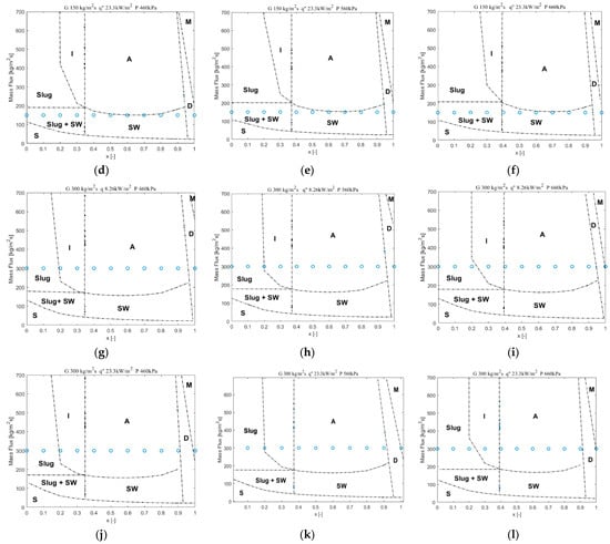 Flow patterns for each experimental condition investigated were predicted with a well-known predictive flow pattern map from Wojtan et al. [29] shown in Figure 9a–l.