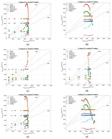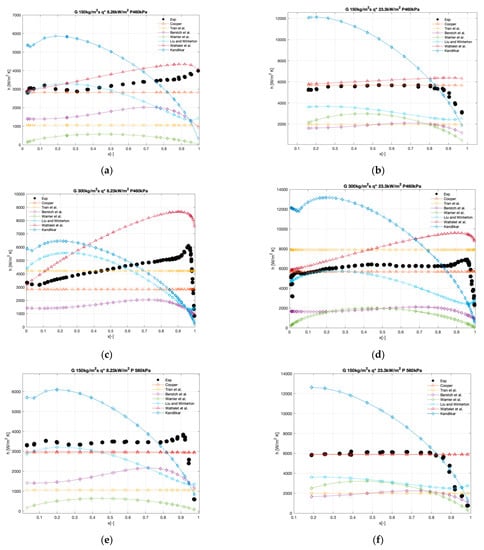 Figure 11a–l depicts the graphical representation of the comparison between each experimental result measured and the calculated heat transfer coefficient developed based on different theoretical assumptions at the different saturation conditions investigated in this study.