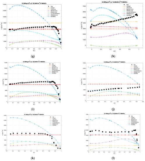 Figure 12a–l shows the trend of how each predictive model is able to capture the experimental trend compared with experimental data over the entire range of vapor qualities. Generally, none of the models selected are able to satisfactorily trace the heat transfer coefficient over the entire range of vapor quality.