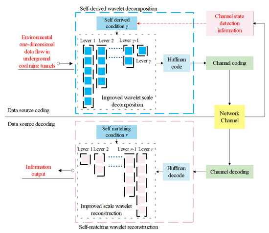 A self-derive characteristic means that under the influence of different external environmental conditions, the data compression algorithm derives the wavelet compression depth based on the channel characteristics to meet the transmission capacity of the wireless communication channel. Based on the channel characteristics such as the signal strength of the wireless communication system detected in real-time, selecting the data compression level suitable for channel capacity is significant for data transmission in the complex environment of coal mine roadways. A flow chart of self-derived characteristics is shown in Figure 2.