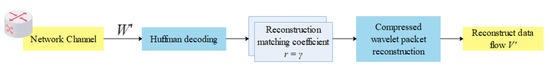 First, the compressed data information W’ is transmitted to the upper computer through the channel, and the receiver receives the information data. Secondly, the compressed information W’ enters the Huffman decoder and expands the data to obtain the decoded data stream. Then, by identifying the matching coefficient r as the derived characteristic coefficient γ, the reconstructed wavelet series is obtained. Finally, through the corresponding wavelet reconstruction algorithm, the data information flow is restored and the data V’ is obtained.