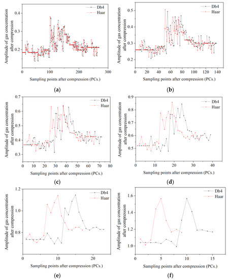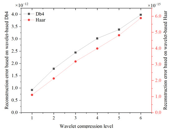 - Combined with the decomposition characteristics of multilevel wavelets shown in Figure 8 when the wavelet base is the Db4 and Haar, it can be concluded that the details are well preserved after compression based on the DB4 wavelet base, resulting in a large, compressed data wave flow;